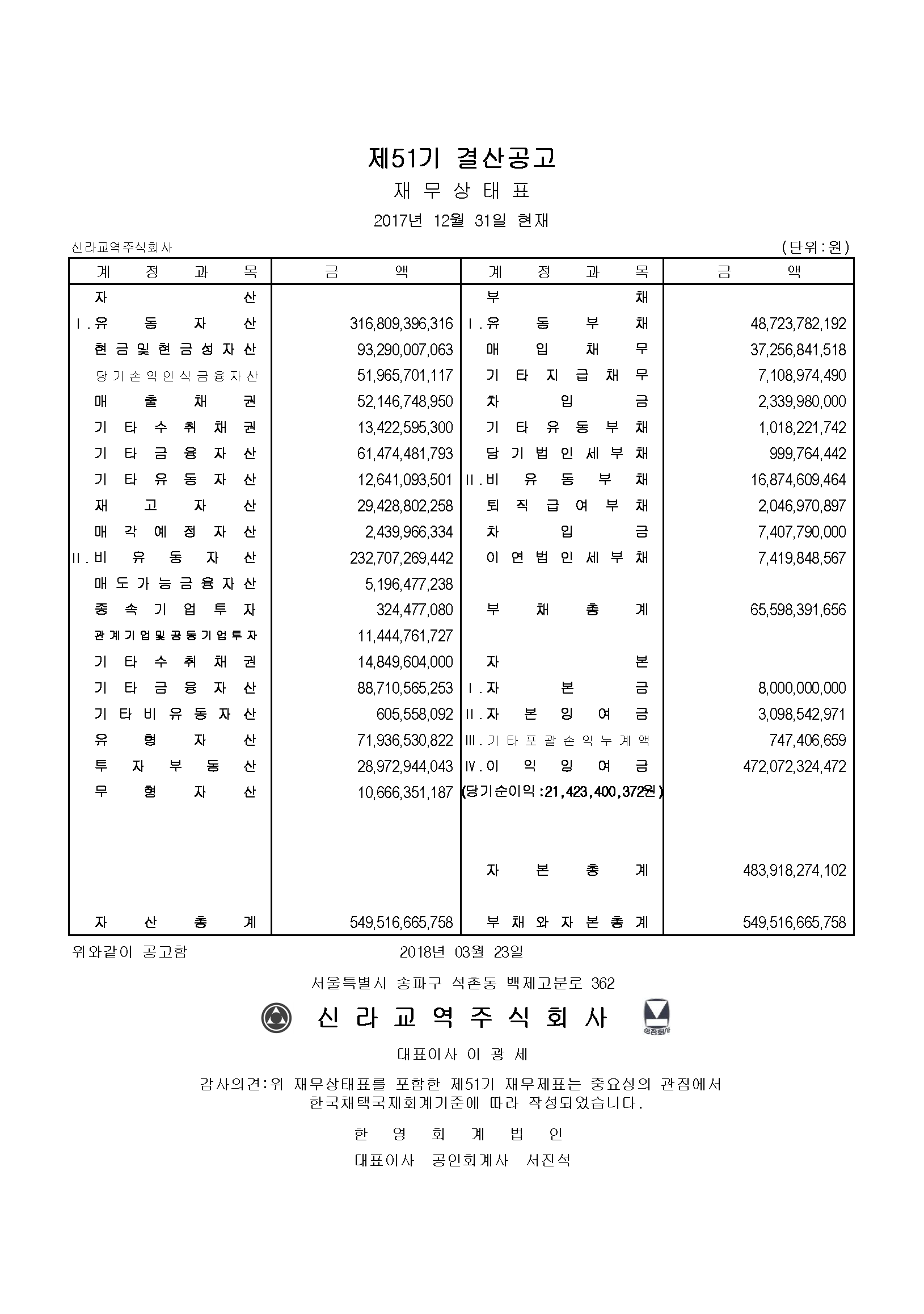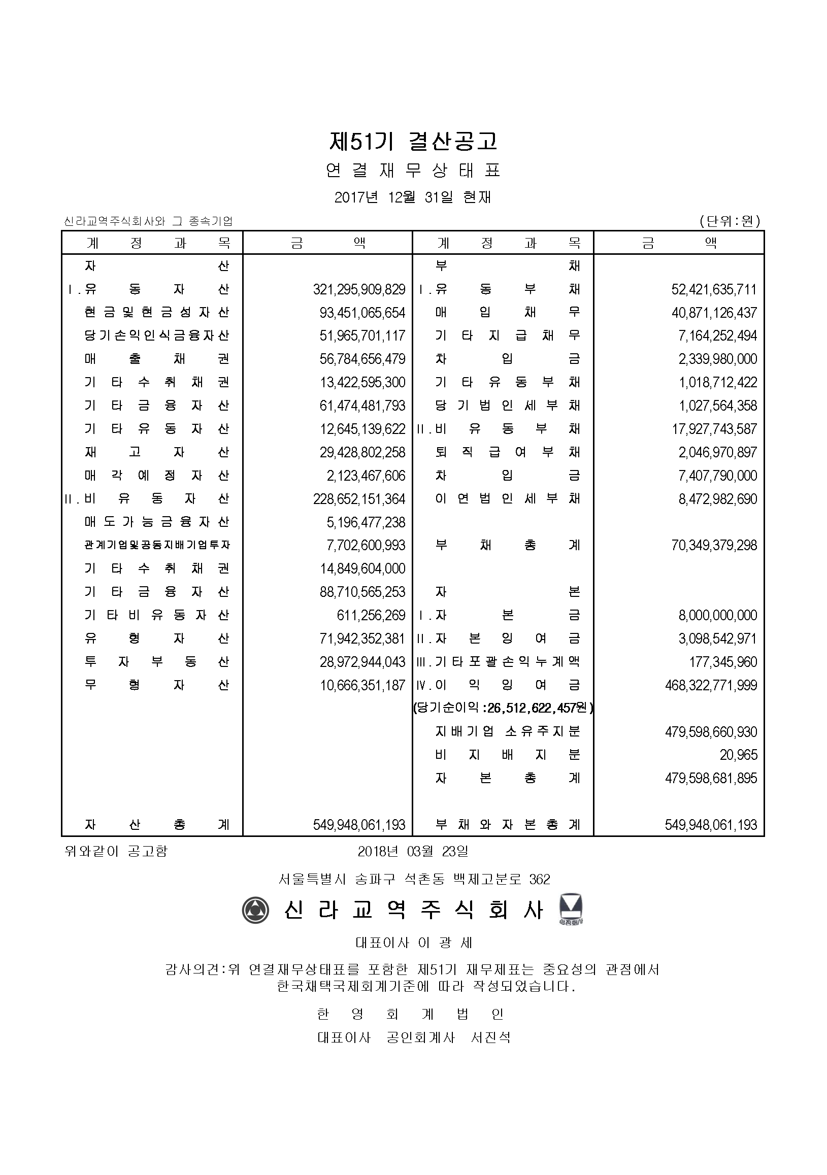 | No.24 | 제 51기 결산공고 | 2018 / 03 / 23 |