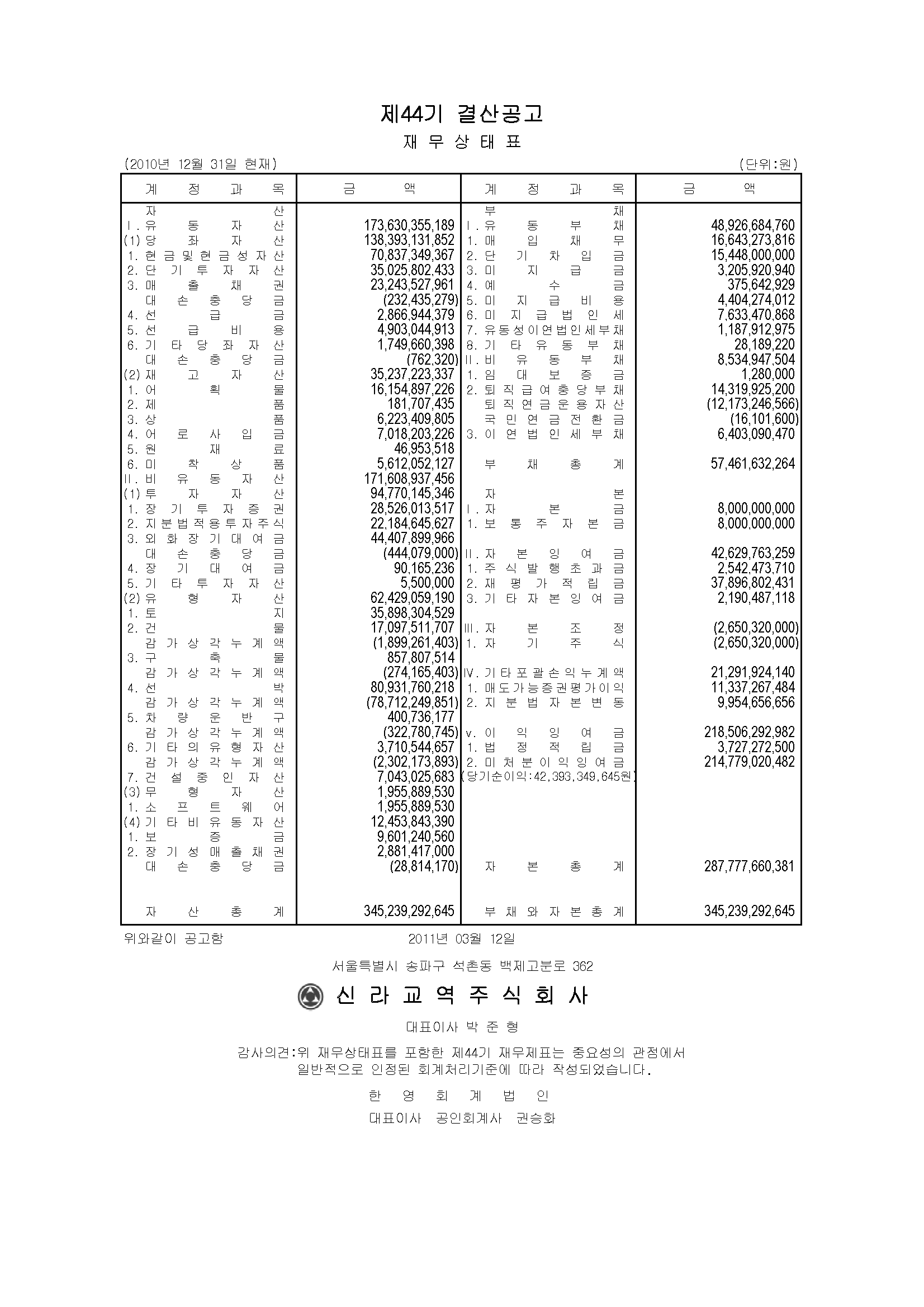 | No.4 | 제 44기 결산공고 | 2011 / 03 / 12 |