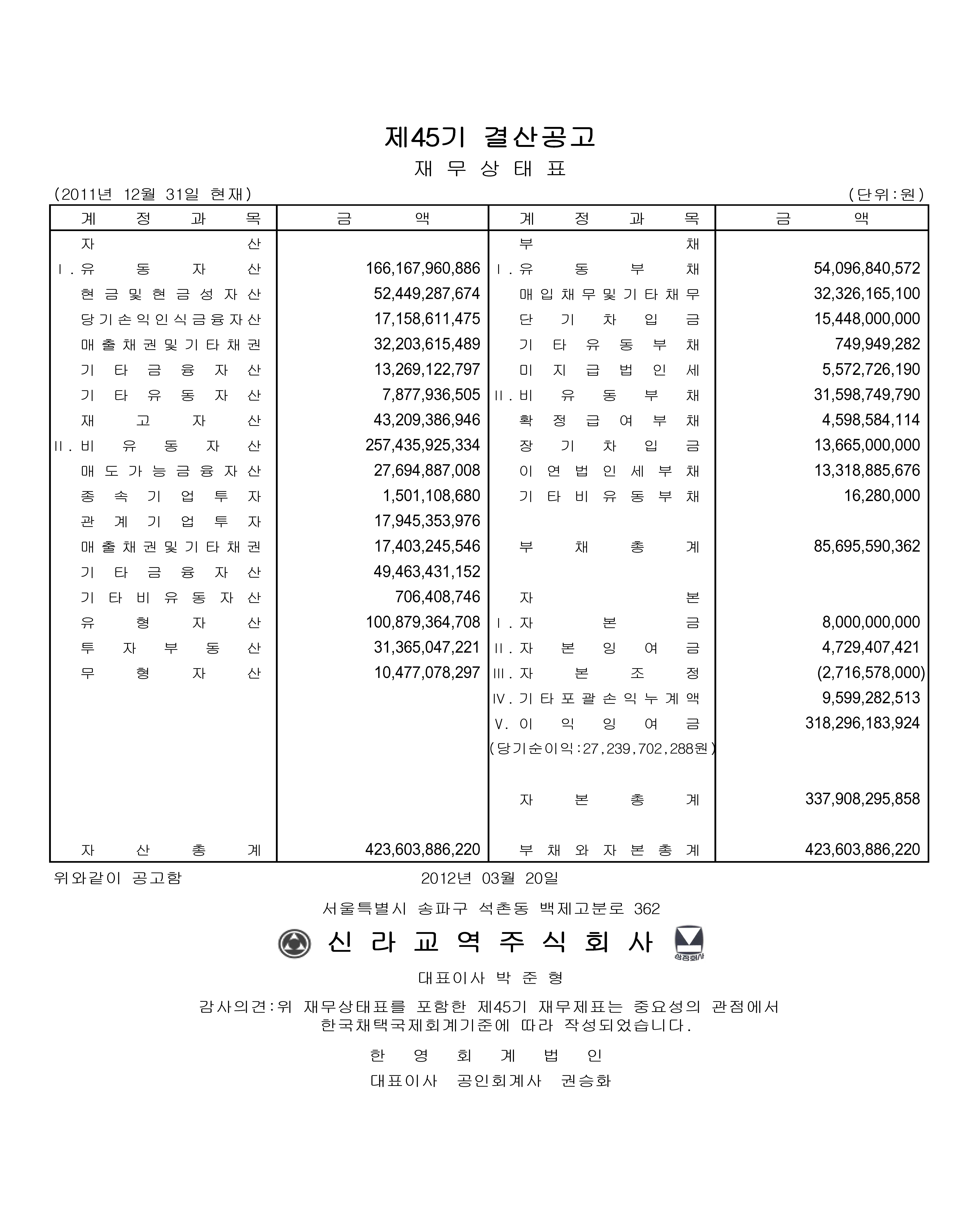 | No.7 | 제 45기 결산공고 | 2012 / 03 / 20 |
